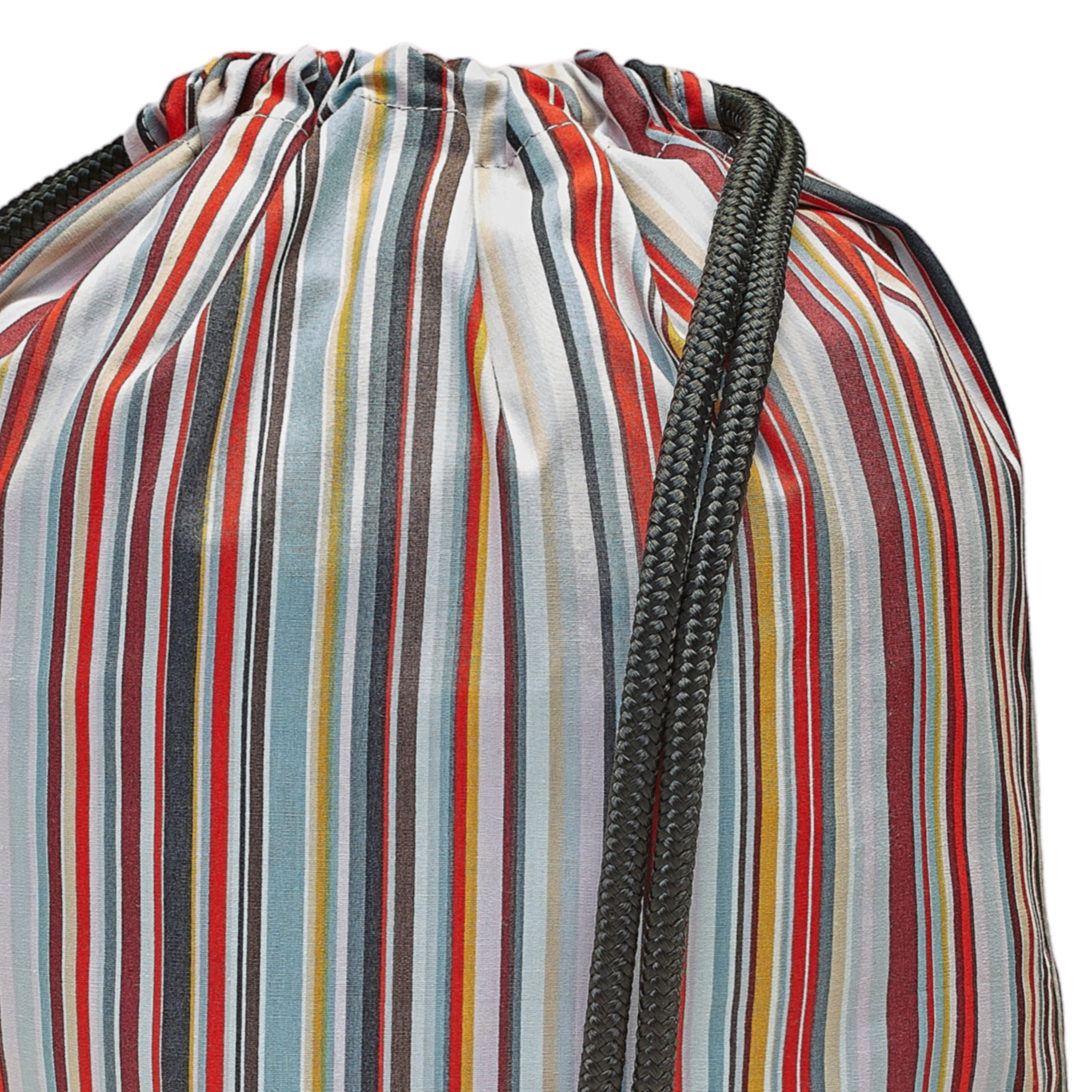 - Designer fabric with colorful stripes, black fabric floor